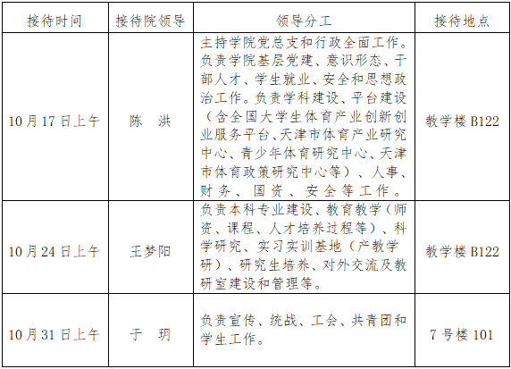 根据《天津体育学院领导干部接待日制度》规定及学院近期工作安排,现将2025年10月院领导接待师生来访安排通知如下。