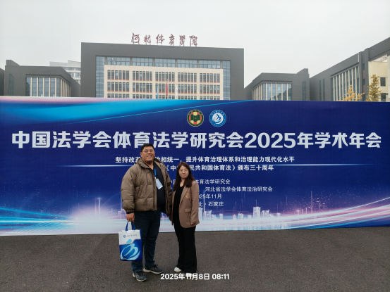 2025年11月8日至9日,中国法学会体育法学研究会2025年学术年会在河北体育学院召开。会议由中国法学会体育法学研究会主办,河北体育学院、河北省法学会体育法治研究会承办。会议以“坚持改革和法治相统一,提升体育治理体系和治理能力现代化水平——纪念《中华人民共和国体育法》颁布三十周年”为主题,汇聚了来自国内高等院校等体育管理部门的法学专家、学者、体育行业代表及法律从业者。我院公共事业管理专业教师高璐与辛芳参加会议。