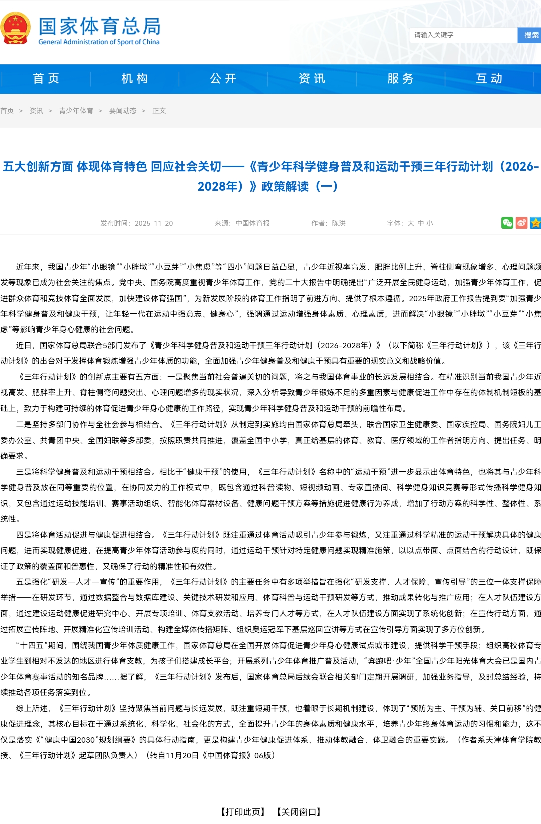 我院陈洪教授作为起草团队负责人在《中国体育报》以《五大创新方面 体现体育特色 回应社会关切——<青少年科学健身普及和运动干预三年行动计划(2026-2028年)>政策解读(一)》为题,进行了专题解读,多家媒体对文章进行了转载。同时,陈洪教授还接受了多家新闻媒体的采访。