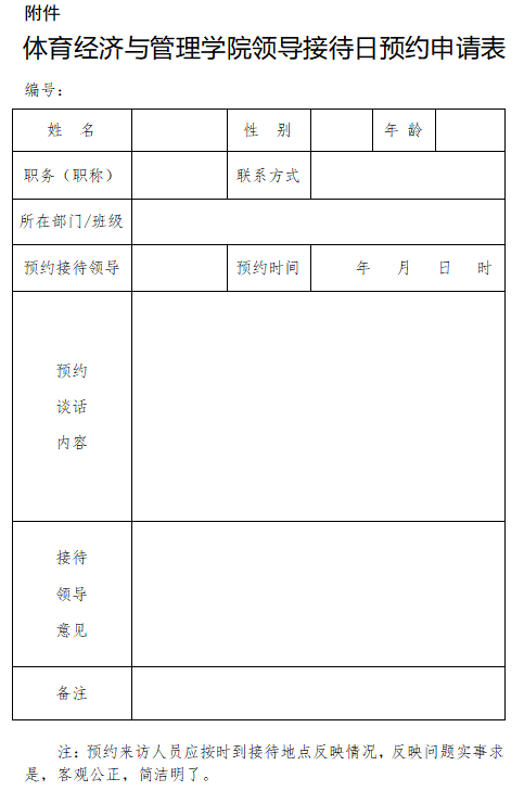1.来访人员须如实填写《体育经济与管理学院领导接待日预约申请表》(见附件),并于接待日前2个工作日发送电子邮件至jgxy@tjus.edu.cn,以便统筹安排。